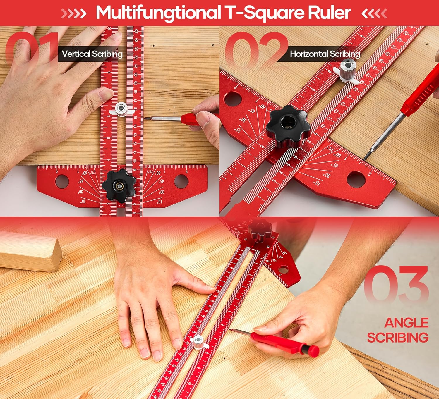 The Saker multifunctional T-square ruler combines a ruler and protractor, offering precise angle and length measurements up to 48 cm (18 inches). Made from durable aluminum alloy with laser-engraved scales for clear readability, it features an adjustable design for marking angles, drawing lines, and setting bevels. Ideal for woodworking, engineering, and design, it includes a red mechanical pencil with refills for added convenience.